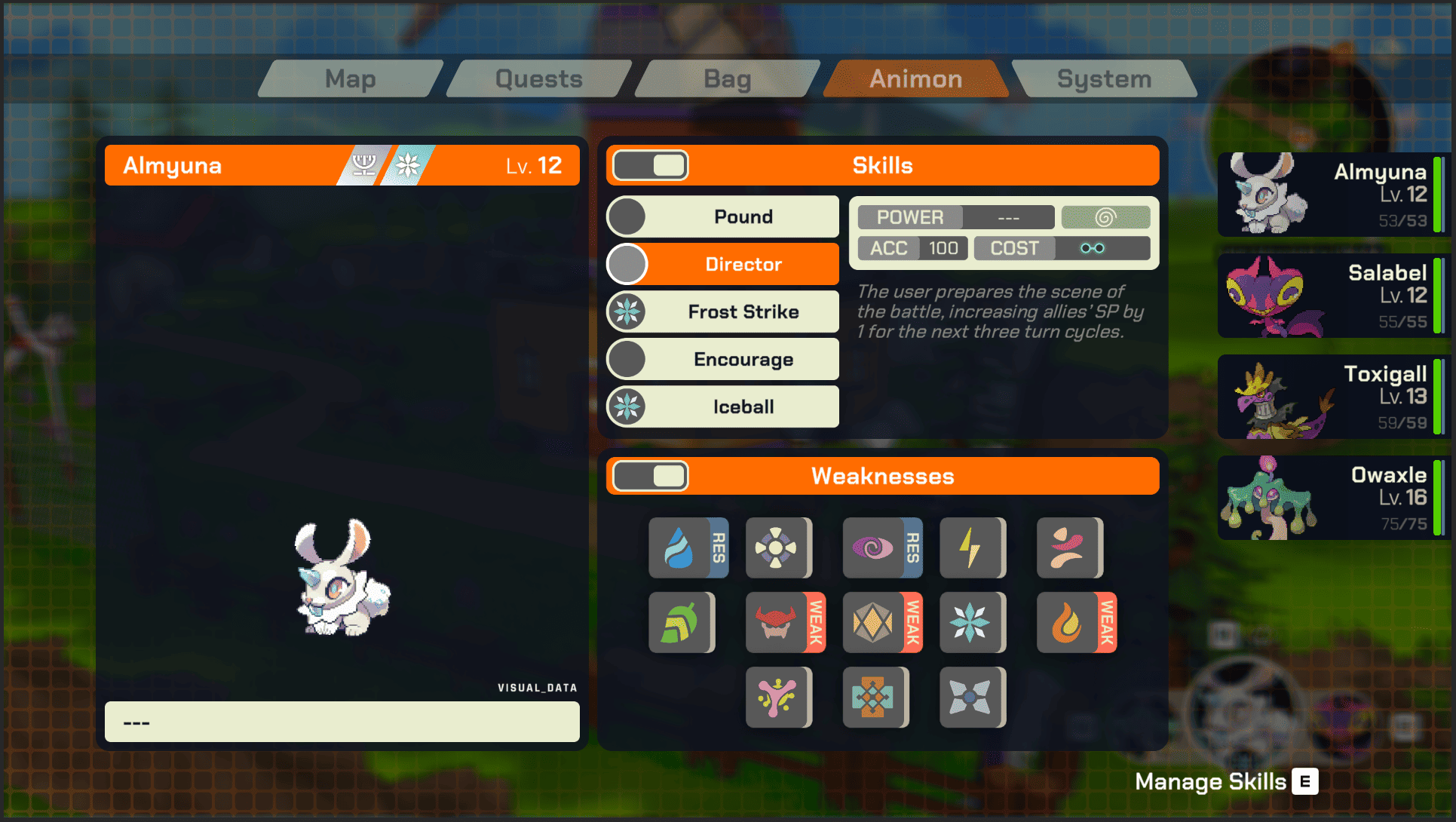 The gameplay is standard monster collector fare: send your monsters onto the field (up to four at a time, which is unusually high) and engage in turn-based combat, using super-effective moves to deplete the enemy’s health bar. I love turn-based games, but fielding four monsters at once makes for a chaotic environment where planning my strategy became a bit too difficult for my little brain - although, to be fair, I only played with the combat system for a few hours, certainly not enough to understand its intricacies. On the other hand, main boss battles are fought against a single strong Animon, which possesses additional health bars and can execute two moves per round. I think the game truly shines at times like these.